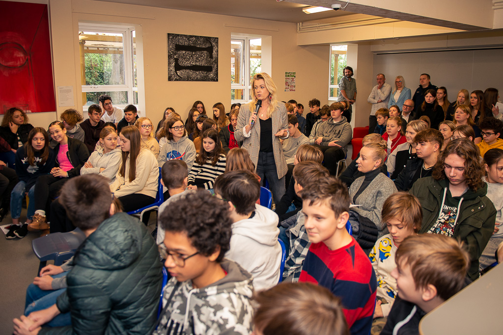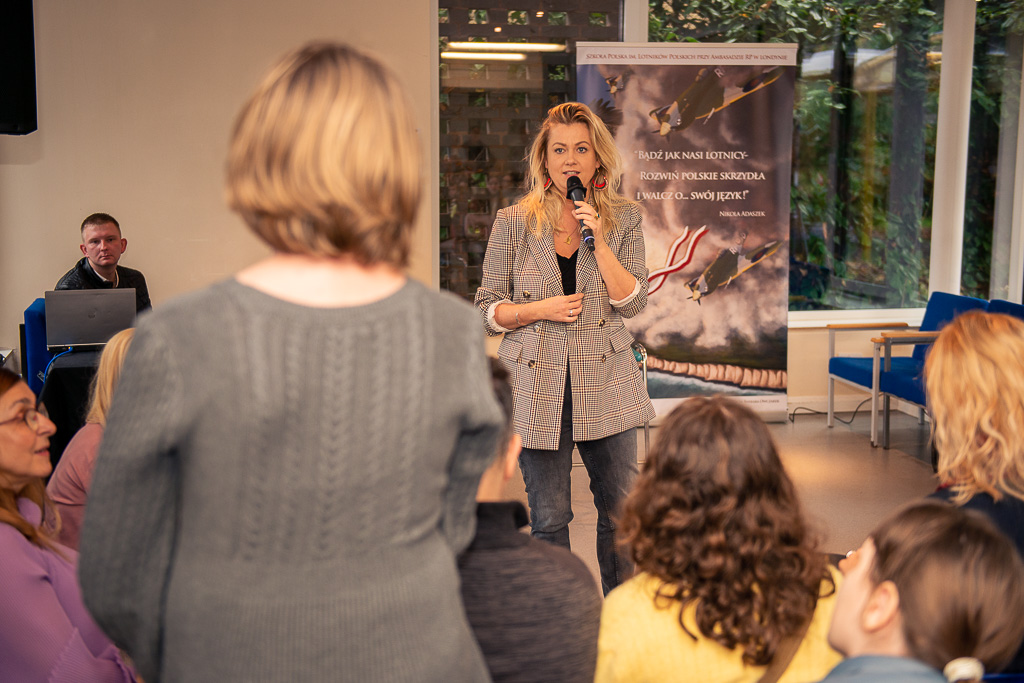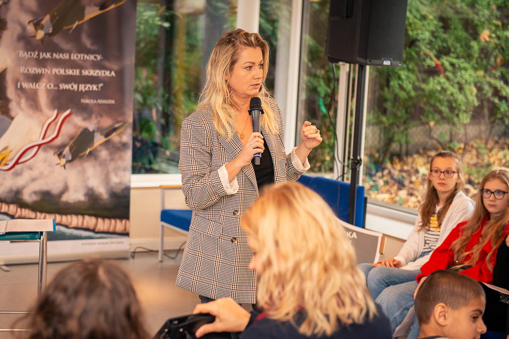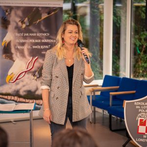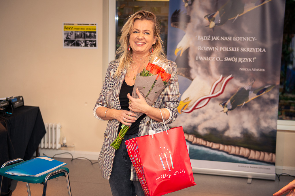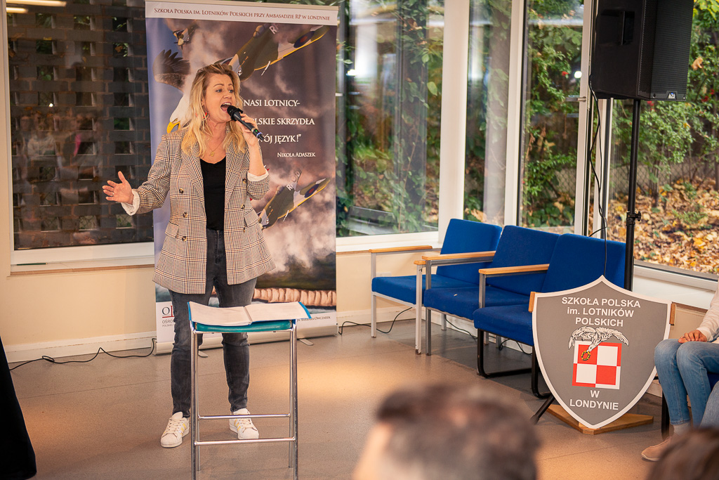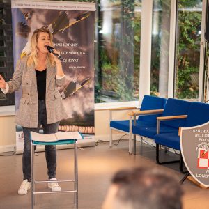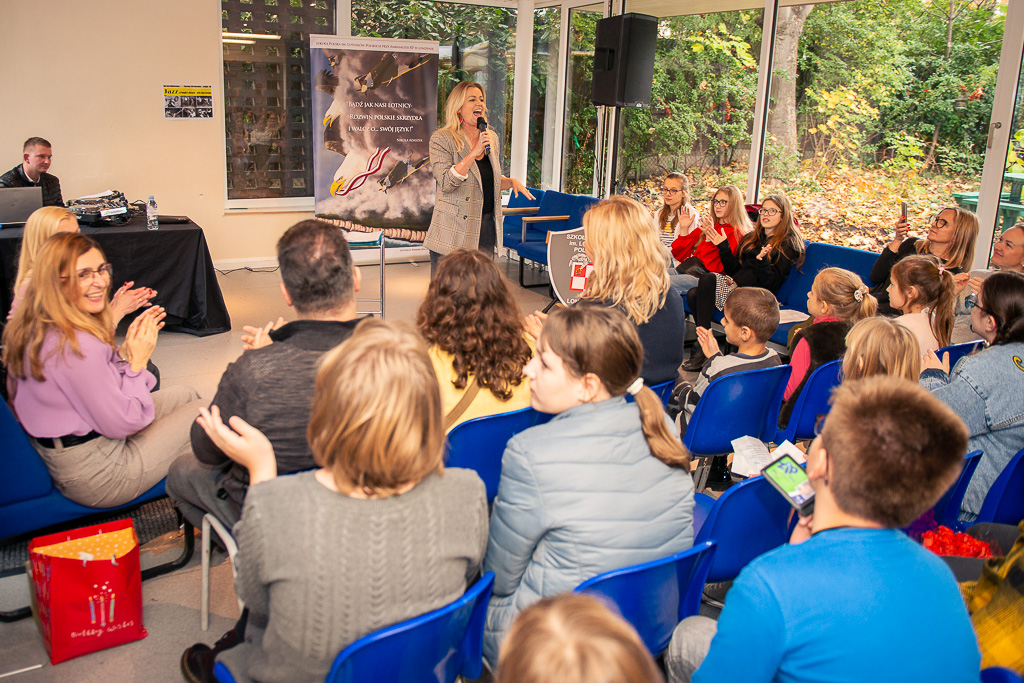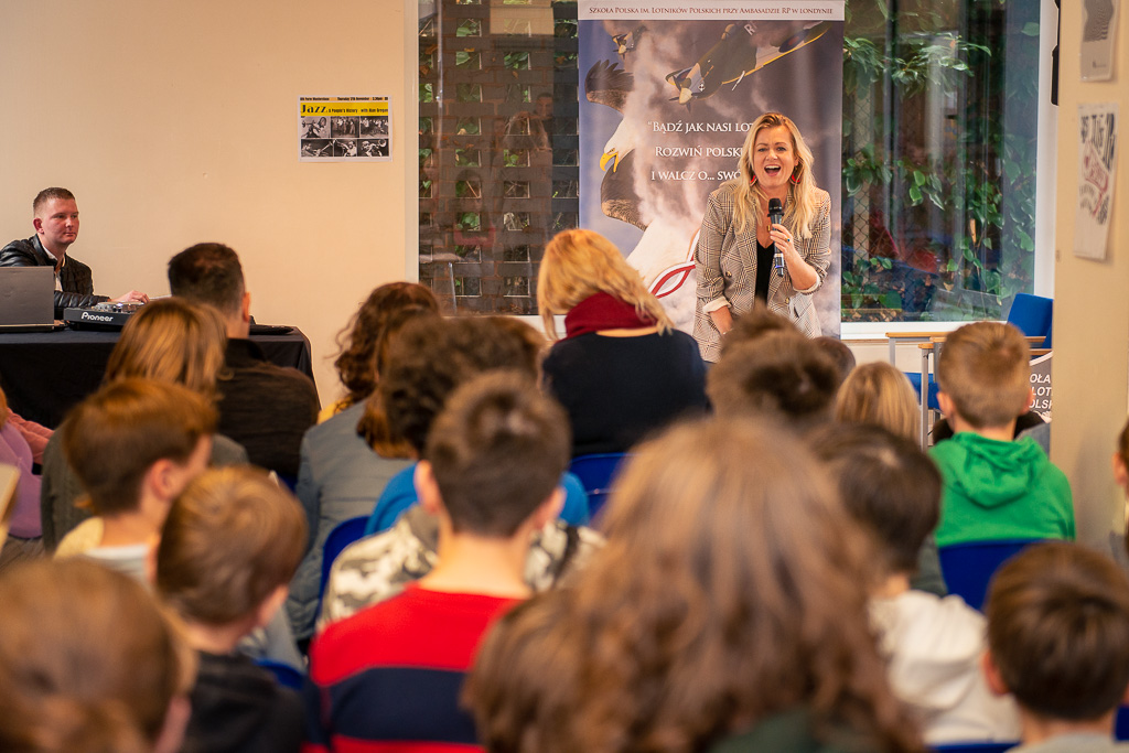 Pani Olga nawiązała świetny kontakt z publicznością. Zachęciła uczniów, rodziców i nauczycieli do wspólnego śpiewu znanych pieśni patriotycznych. Zaśpiewała też kilka utworów ze swojej solowej płyty. Opowiedziała o wymagającej  pracy aktorskiej i karierze muzycznej.