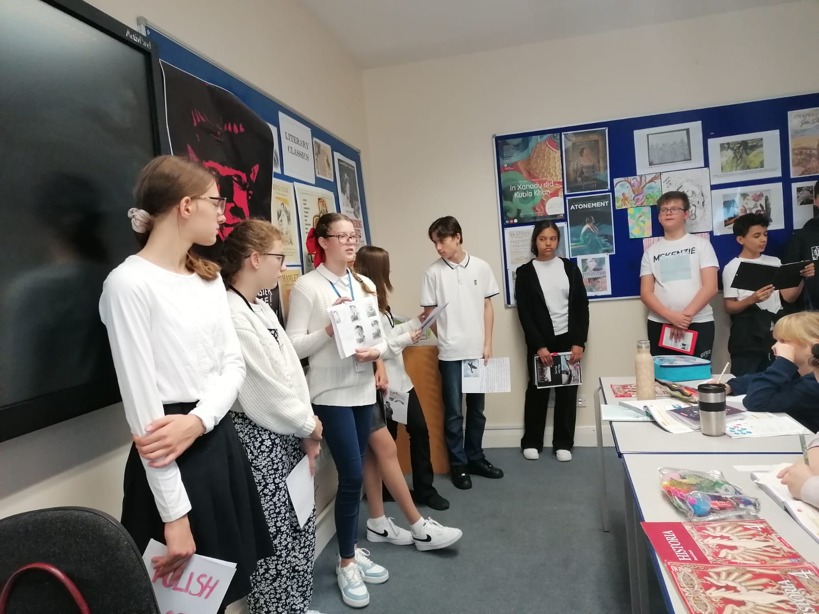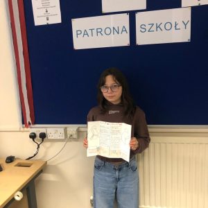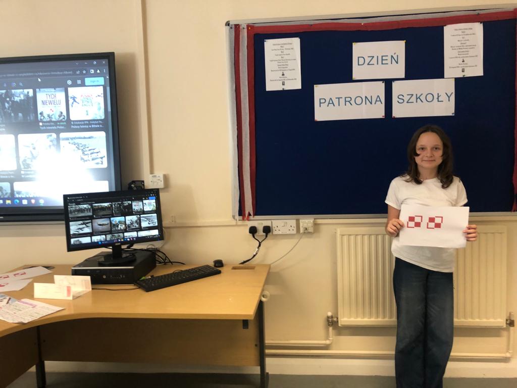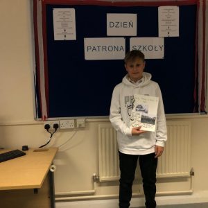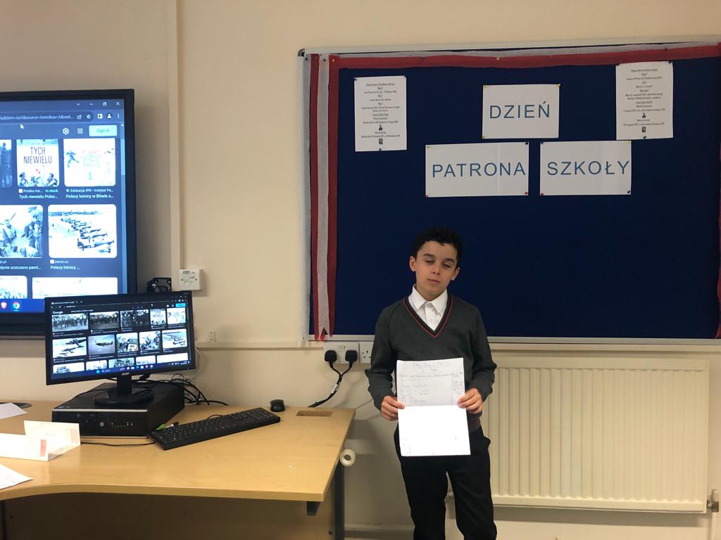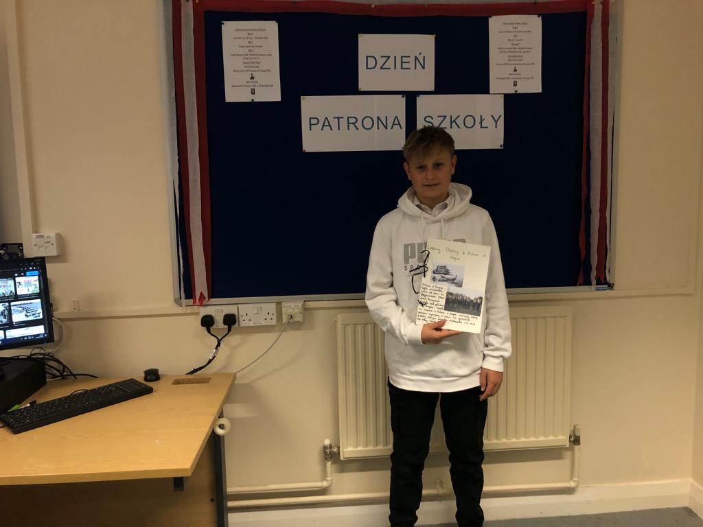 Gotowe prace uczniowie zaprezentowali innym klasom i podzielili się swoją wiedzą na temat naszych patronów.