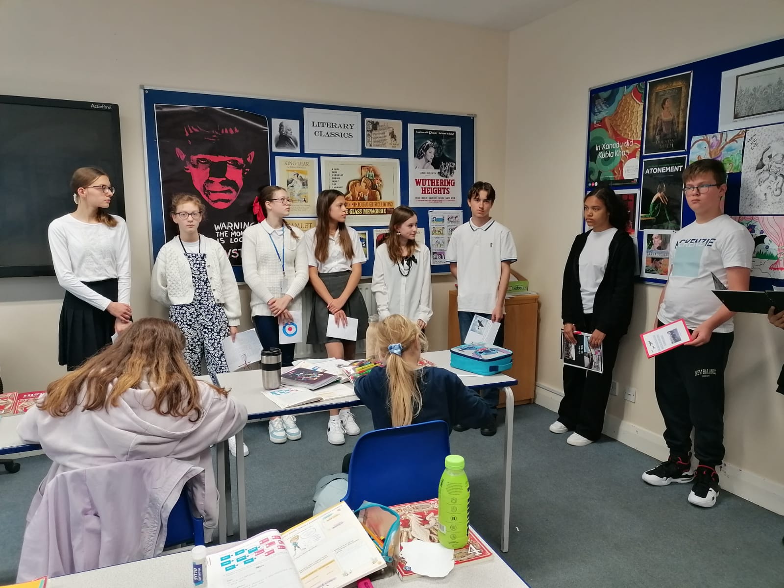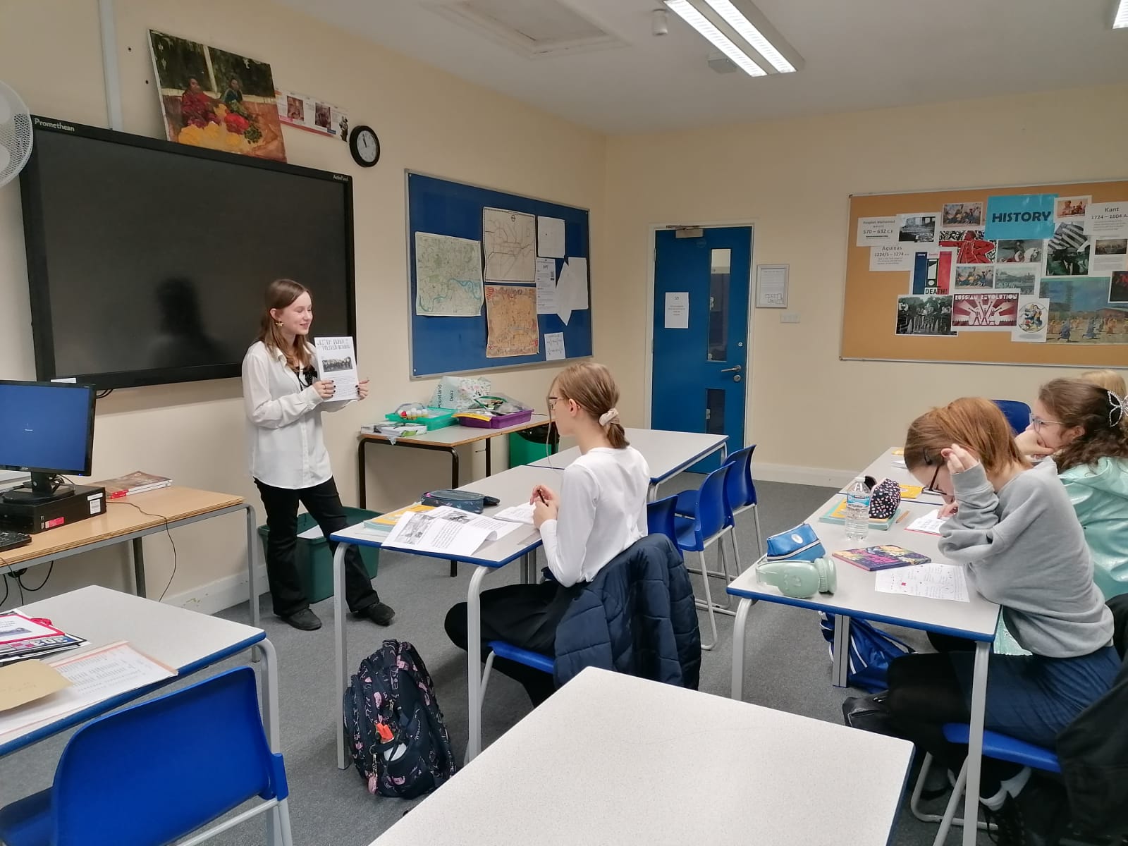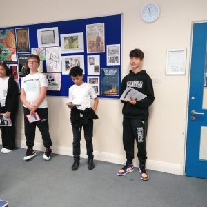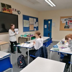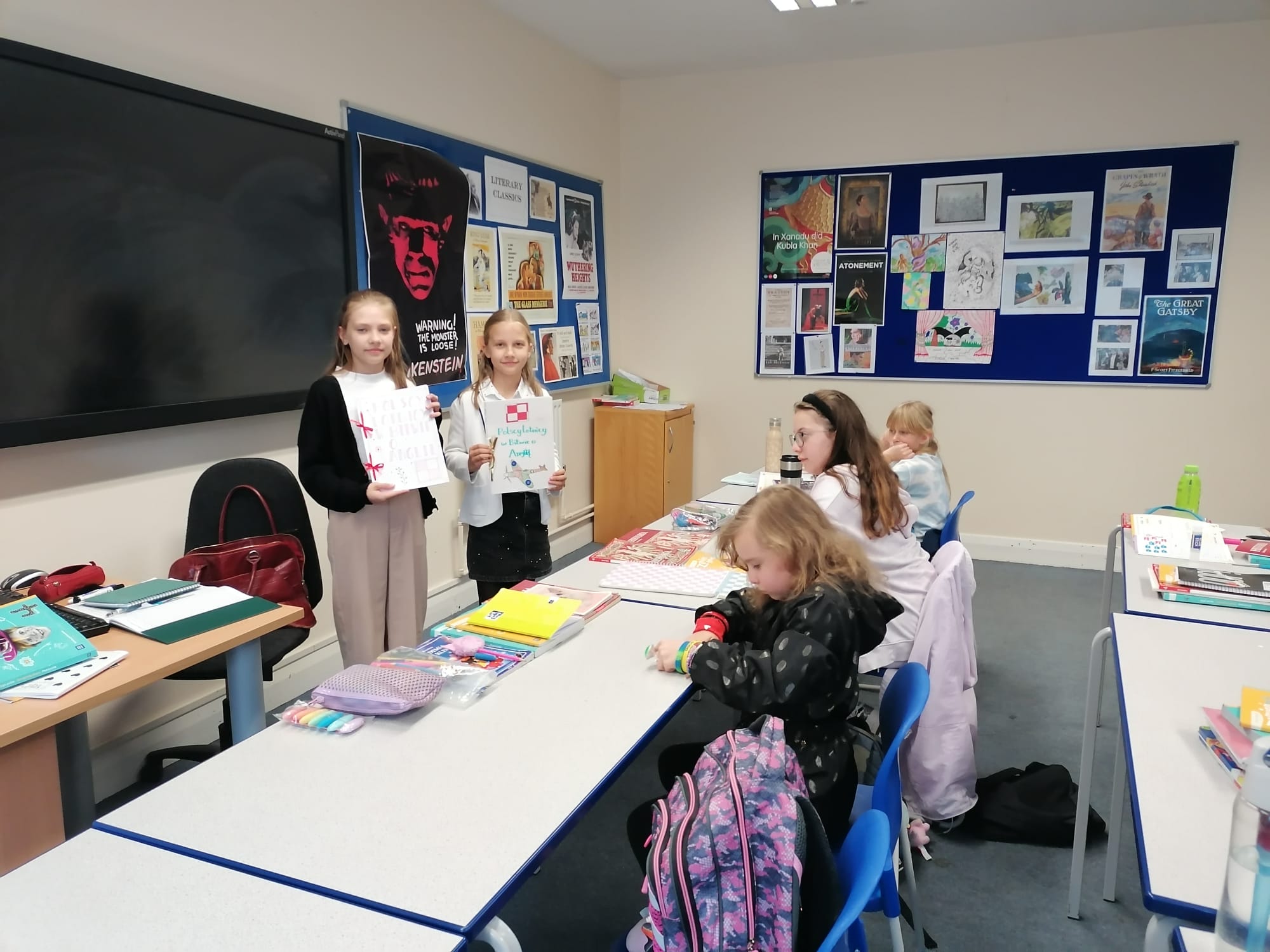 Gotowe prace uczniowie zaprezentowali innym klasom i podzielili się swoją wiedzą na temat naszych patronów.