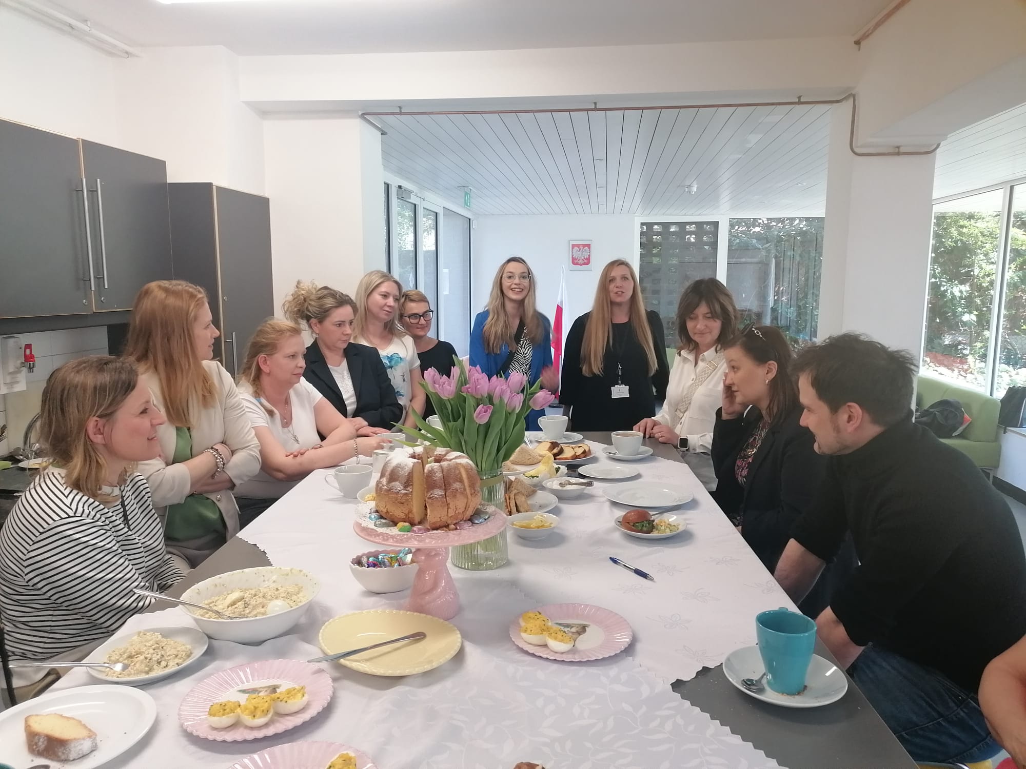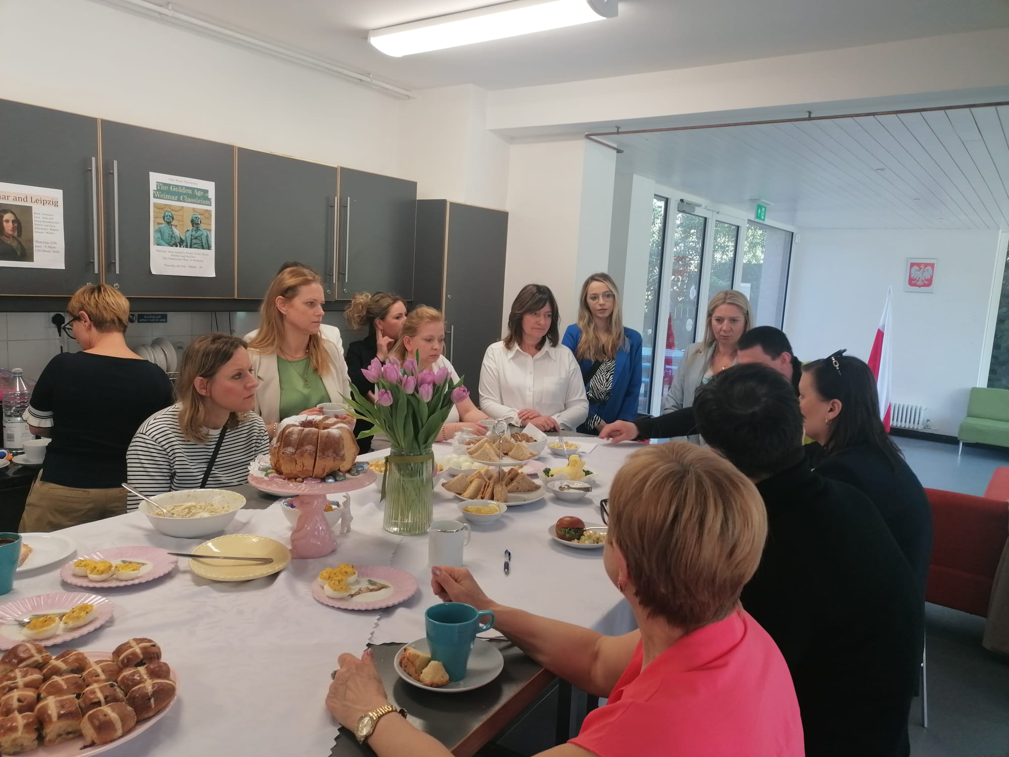 przy wspaniale zastawionym stole z polskimi i angielskimi wielkanocnymi specjałami.