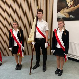 Całą akademię uświetnili swą obecnością uczniowie klasy 2a, 8a oraz uczennice z klasy 6a, a uczniowie liceum stali w poczcie sztandarowym.